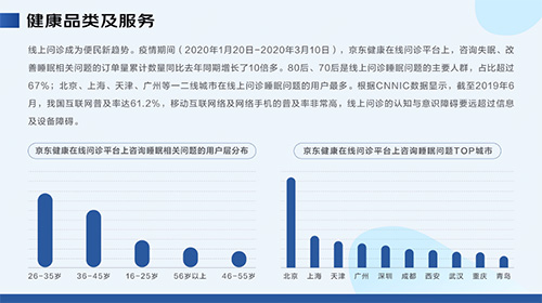 据报告统计,全国有超过3亿人有睡眠障碍,超过7成受访用户表示存在不同程度、不同表现形式的睡眠问题;针对睡眠问题,京东健康在线问诊平台上咨询累计订单量,同比去年增长10倍以上;改善睡眠类保健品、药品、滋补品的线上成交额也呈现出稳定增长的趋势,安神茶、酸枣仁茶2019年成交额同比增长384%、259%。