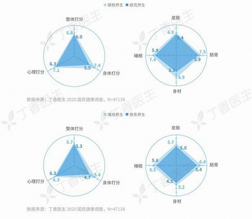 与此同时,“朋克养生”和“佛系养生”人群尽管是对健康都没有什么期待和要求的两群人,但默默努力的“朋克养生”人群各项健康状态均优于不想不干的“佛系人群”。
