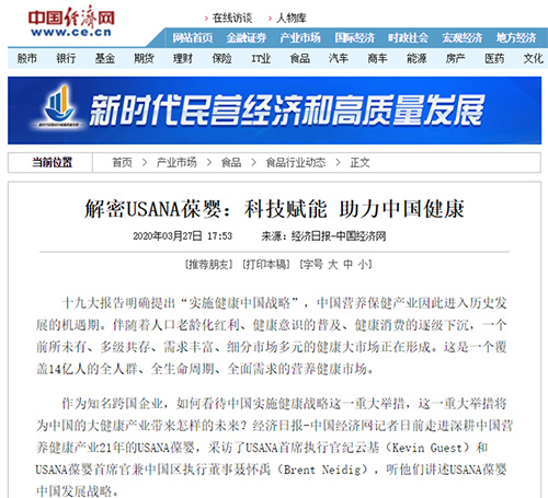 日前,致力于打造“最具权威性的财经网站和最有影响力互动平台”的中国经济网专访USANA首席执行官纪云基(Kevin Guest)先生和USANA葆婴首席官兼中国区执行董事聂怀禹(Brent Neidig)先生,并于3月27日发表了题为《解密USANA葆婴:科技赋能 助力中国健康》的深度报道。