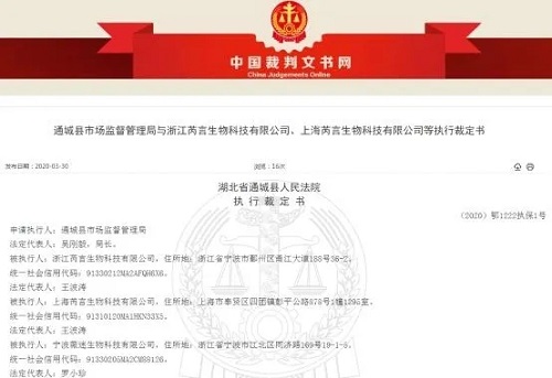 天眼查显示,2019年11月25日,浙江芮言生物曾因“广告违法行为”,被宁波鄞州区市场监管局查处,并累计罚款50万元。