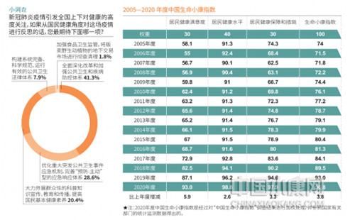 2020年2—3月,《小康》杂志社联合国家信息中心,并会同有关专家及机构,对“2020中国生命小康指数”进行了调查。经过对调查结果进行加权处理,并参照国家有关部门的监测统计数据和大量社会信息,得出“2020中国生命小康指数”为96.8分,比上一年度提高3.8分。