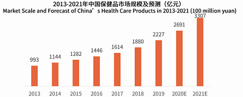 艾媒咨询分析师认为,在国家政策引导,居民健康观念升级,消费人群比例上升,以及行业技术迭代升级加快等多重因素作用下,保健品行业将保持长期增长态势,预计2021年市场规模将突破3300亿元。