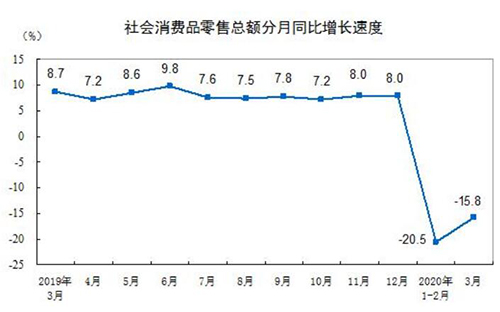按经营单位所在地分,3月份,城镇消费品零售额22974亿元,同比下降15.9%,降幅比1—2月份收窄4.8个百分点;乡村消费品零售额3476亿元,下降15.1%,降幅比1—2月份收窄3.9个百分点。1—3月份,城镇消费品零售额67855亿元,同比下降19.1%;乡村消费品零售额10725亿元,下降17.7%。