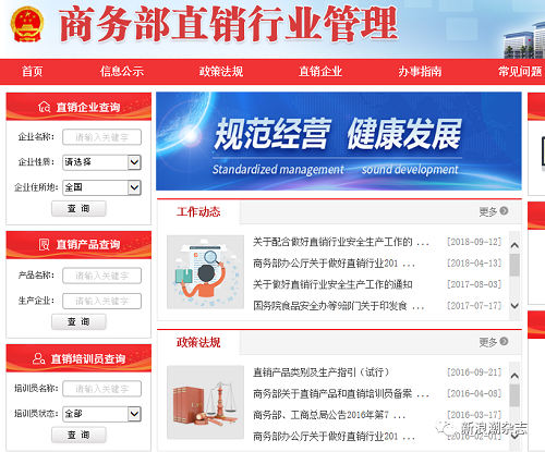此外,“商务部直销管理”的网站许久没有更新动态,最近的一则工作动态更新于2018年9月12日,最新的一则政策法规停留在2016年9月21日。