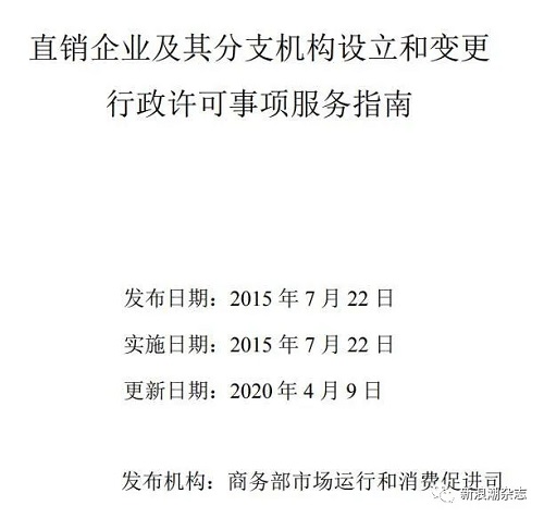 而在“直销企业及其分支机构设立和变更审批”一栏中,新浪潮记者注意到,《直销企业及其分支机构设立和变更行政许可事项服务指南》更新于2020年4月9日,发布机构为商务部市场运行和消费促进司。