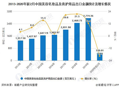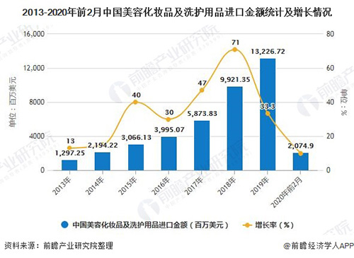 在进口金额方面,2019年全年中国美容化妆品及护肤品进口金额达到13226719千美元(13226.72百万美元),累计增长33.3%。截止至2020年1-2月中国美容化妆品及洗护用品进口金额达到2074.9百万美元,累计增长9.9%。