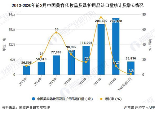 据中国海关总署数据显示,2019年全年中国美容化妆品及护肤品进口量达到了227400吨,累计增长11.7%。截止至2020年1-2月中国美容化妆品及洗护用品进口量达到53836吨,累计增长1.2%。