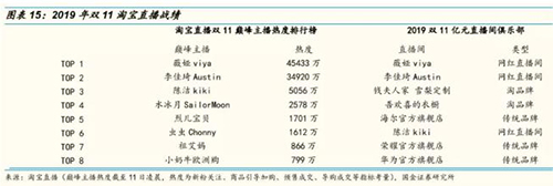 国金证券(9.100, -0.12, -1.30%)研报显示,2019年“双11”淘宝直播引导成交近200亿,有17个直播间引导成交超过亿元,其中4个网红直播间(薇娅、李佳琦等)、3个淘品牌直播间(雪梨、张大奕等)、其余都是传统大品牌的天下(小米、海尔等)。从淘宝直播双11巅峰直播热度排行榜也能看出主播带货的头部化,薇娅、李佳琦二人的热度(粉丝关注度、导购成交等指标综合考量)是第二梯队的10倍以上,考虑到成交额也是数倍以上,保守估计薇娅、李佳琦“双11”的引导成交至少超过5亿、3亿。与商家直播犬牙交错的格局相比,网红直播带货的马太效应无疑是巨大的。