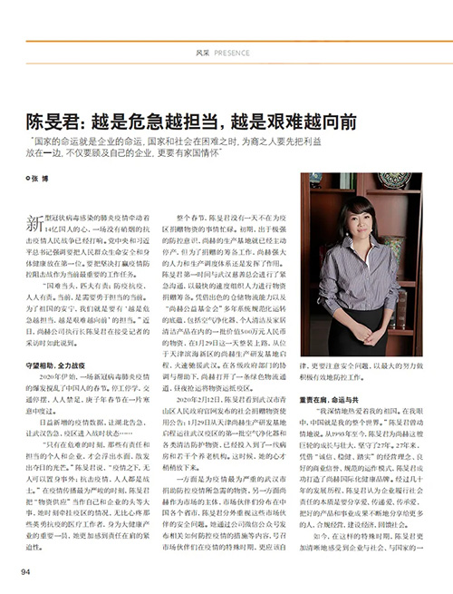 近日,尚赫公司陈旻君执行长入选《中华儿女》“复工复产助力计划”,展示尚赫品牌“女神”的大爱形象,诠释尚赫的履行社会责任形象,积极投身社会建设,尚赫时刻践行着。