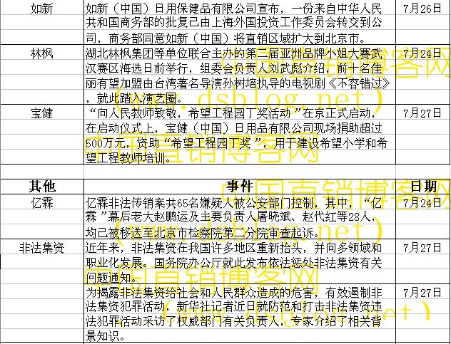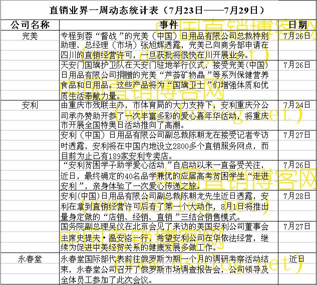 直销业界一周动态统计表(7月23日—7月29日)