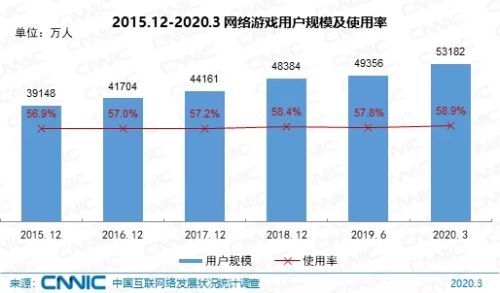 截至2020年3月,我国网络游戏用户规模达5.32亿,较2018年底增长4798万,占网民整体的58.9%;手机网络游戏用户规模达5.29亿,较2018年底增长7014万,占手机网民的59.0%。