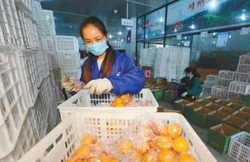 近日,湖南怀化市靖州苗族侗族自治县推进“社交电商+扶贫助农”新模式破解农产品销售难题。图为电商工作人员在为消费者挑拣冰糖橙。人民视觉