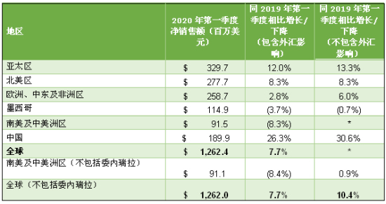 2020年第一季度全球净销售额为13亿美元,与2019年同期相比增长7.7%。