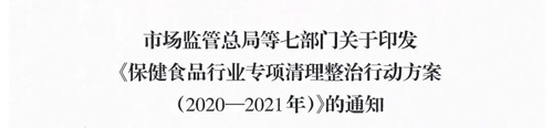 据悉,4月30日市场监管总局等七部委联合印发《保健食品行业清理整治行动方案(2020-2021年)》,力争在2021年年底前有效净化保健食品市场,不断提高人民群众对保健食品消费市场的获得感、幸福感、安全感。