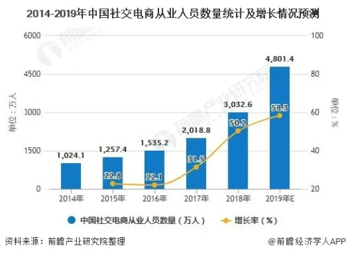 2018中国社交电商从业者规模达到3032.6万人,增长率为50.22%,社交电商受到了更广泛关注,越来越多的人群加入到社交电商从业者大军中来。2019年中国社交电商从业者规模预计达到4801万人,增长率为58.3%。