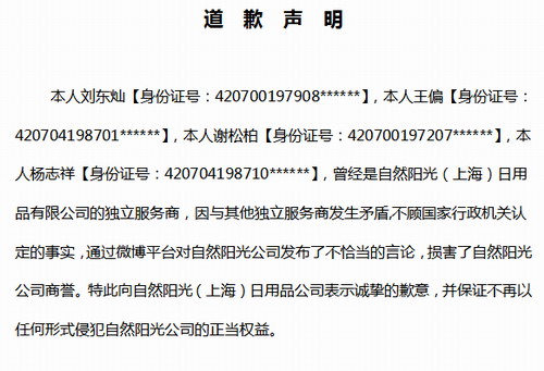 刘某灿等人在道歉信中表示:自己曾经是自然阳光公司的独立服务商,因与其他独立服务商发生矛盾,不顾国家行政机关认定的事实,通过微博平台对自然阳光公司发表了不恰当的言论,损害了自然阳光公司商誉,向自然阳光公司表示诚挚的歉意,并保证不再以任何形式侵犯自然阳光公司的正当权益。