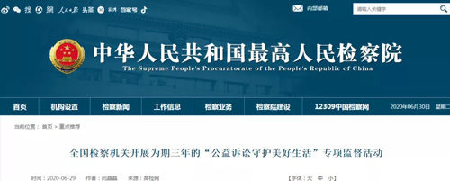 6月29日,最高人民检察院召开全国检察机关“公益诉讼守护美好生活”专项监督活动动员部署电视电话会议,决定自2020年7月至2023年6月,开展为期三年的“公益诉讼守护美好生活”专项监督活动。