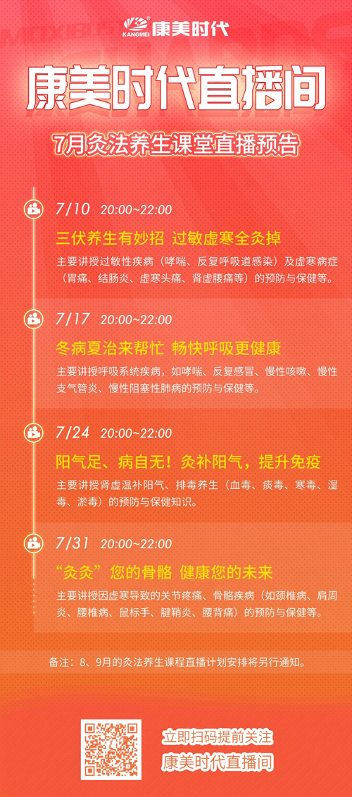 三伏灸“冬病夏治”体验营启动期间,除了线上线下的体验营外,公司还为大家安排了每周一期的灸法系列养生课堂,将于7-9月的每周周五进行在线直播,每周直播主题不同,精彩不同,7月灸法养生课堂直播彩蛋预告如下: