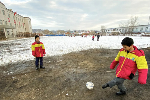 ▲零下20多度的黑龙江省牡丹江市爱民区八达小学小学生上足球课