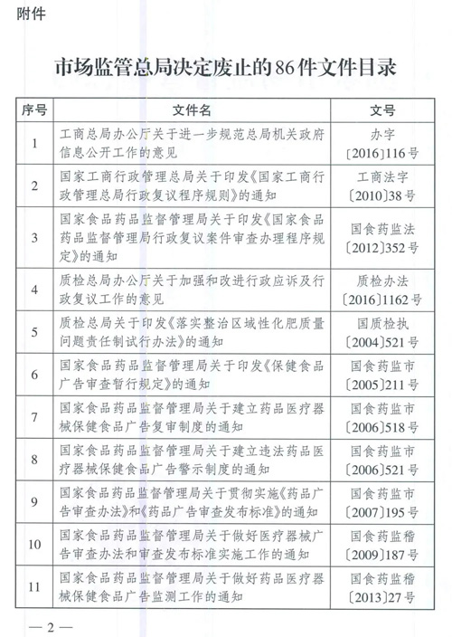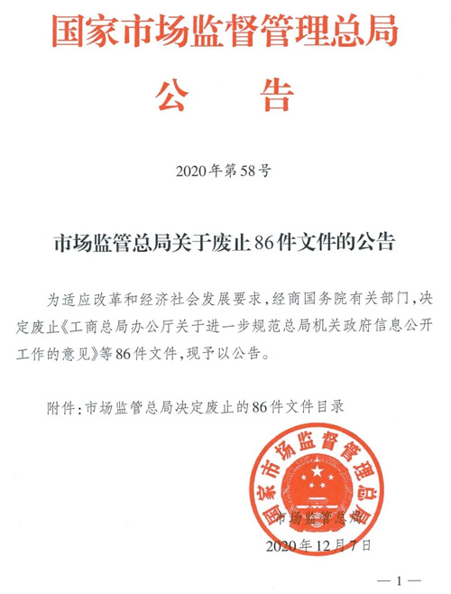 为适应改革和经济社会发展要求,经商国务院有关部门,决定废止《工商总局办公厅关于进一步规范总局机关政府信息公开工作的意见》等86件文件,现予以公告。
