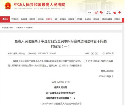 12月9日,最高人民法院召开新闻发布会,发布《最高人民法院关于审理食品安全民事纠纷案件适用法律若干问题的解释(一)》(以下简称《解释》),《解释》将于2021年1月1日起施行。规定称,对于消费者而言,网络食品潜藏着一定的风险,如果入网食品经营者资质、信誉不能保证,则容易引发食品安全问题,进一步明确了电商平台责任承担以及电商平台自营及自营误导责任。