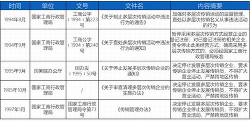在1994年8月,国家工商管理行政管理局发布了《关于制止多层次传销活动中违法行为的通告》(工商公字﹝1994﹞第223号),通告中对多层次传销活动的监督管理提出了要求,并要求坚决查处以多层次直销名义从事的违法行为。同年9月,国家工商行政局管理局继续发布《关于查处多层次传销活动中违法行为的通知》(工商公字﹝1994﹞第240号),暂停了采用多层次传销方式经营企业的注册,并对已注册的相关企业,停止采用多层次传销的经营方式。
