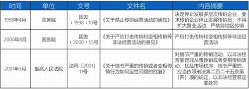 在这个背景之下,1998年4月,国务院发布《关于禁止传销经营活动的通知》(国发﹝1998﹞10号)。《通知》中明确指出中国当前的国庆不适合发展传销行业,必须严厉禁止传销经营活动。此时,传销和直销尚未有明确区分,《通知》的出台在打击了非法传销的同时,也对直销企业造成了巨大冲击。随后在2000年8月,国务院发布《关于严厉打击传销和变相传销等非法经营活动的意见》(国发﹝2000﹞55号)并转给原工商局、公安部及人民银行,表明了国务院继续打压行业的决心。