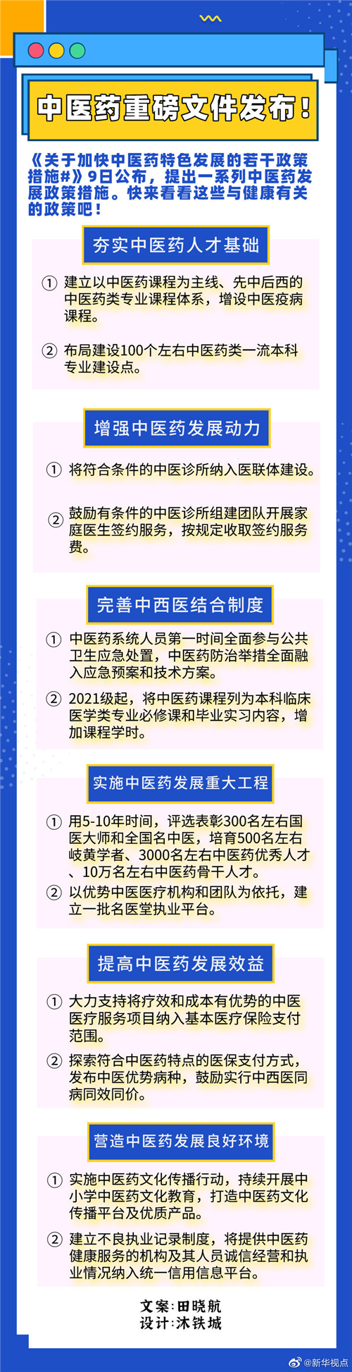 《政策措施》强调,要夯实中医药人才基础,提高中医药教育整体水平,坚持发展中医药师承教育,加强中医药人才评价和激励。要提高中药产业发展活力,优化中药审评审批管理,完善中药分类注册管理。要增强中医药发展动力,保障落实政府投入,多方增加社会投入,加强融资渠道支持。要完善中西医结合制度,创新中西医结合医疗模式,健全中西医协同疫病防治机制,完善西医学习中医制度,提高中西医结合临床研究水平。要实施中医药发展重大工程,实施中医药特色人才培养工程,加强中医医疗服务体系建设,加强中医药科研平台建设,实施名医堂、中医药产学研医政联合攻关、道地中药材提升工程,建设国家中医药综合改革示范区,实施中医药开放发展工程。要提高中医药发展效益,完善中医药服务价格政策,健全中医药医保管理措施,合理开展中医非基本服务。要营造中医药发展良好环境,加强中医药知识产权保护,优化中医药科技管理,加强中医药文化传播,提高中医药法治化水平,加强对中医药工作的组织领导。