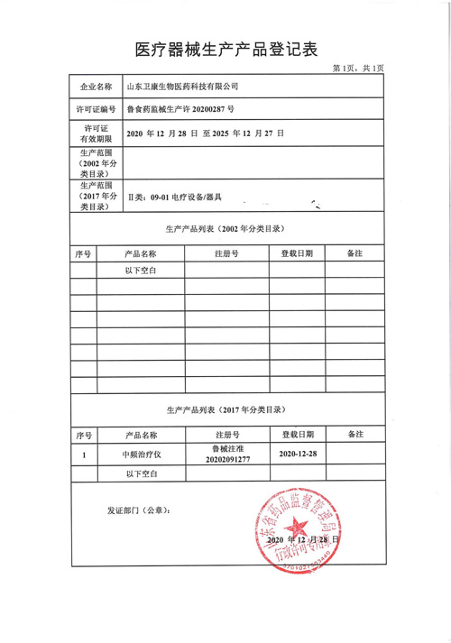 由卫康生物集团自主研发的中频治疗仪(航天康养仪)获国家Ⅱ类医疗器械注册证。这意味着,中频治疗仪将可运用于医疗健康的领域,人类通向健康的途径再增新方法、新手段。