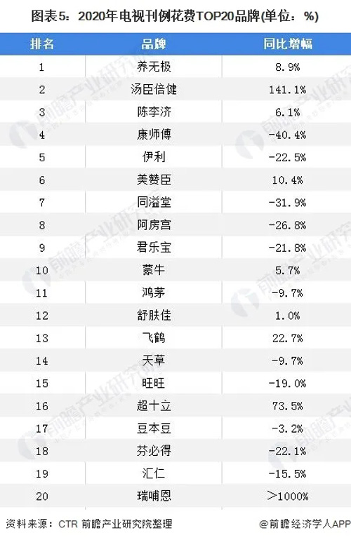 2020年电视刊例花费TOP20品牌占电视总体比重20.6%。电视刊例花费排名前三位的分别为养无极、汤臣倍健和陈李济,在TOP20品牌中,保健食品及乳制品品牌占据榜单半数席位。其中,保健食品品牌汤臣倍健2020年电视刊例花费同比增速141.1%,在TOP20品牌中排名第一。