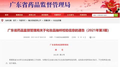 2021年4月7日,广东省药品监督管理局发布《关于化妆品抽样检验信息的通告》(2021年第3期)。据了解,此次共对633批次化妆品进行抽样检验信息,经检验合格样品607批次,不合格样品26批次。