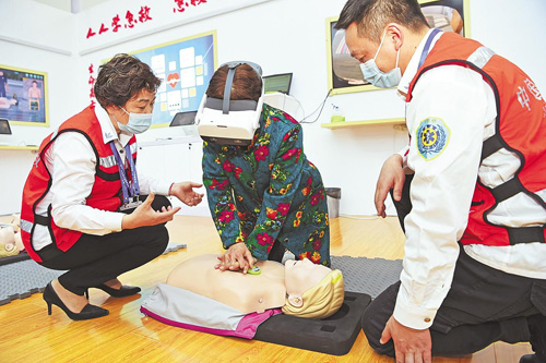 现场观众体验急救模拟培训VR系统。(湖北日报全媒记者 李溪 摄)