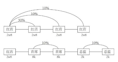 总监及首席推荐奖金为10%,红店推荐奖金为30-50%,其中30%为第一级红店提成,第二级第三级均为10%,总共50%。只有第一次平级推荐才有推荐奖金,奖金百分比计算基数为邀请下线等级对应最低拿货金额。平级推荐后自身需7天内完成升级,否则无上下线关系,直接成为红色店下线,例如红色店下线首席1推荐一位新首席2加入团队,首席1获得8000*10%= 800元,首席1需在7天内升级为红店,否则7天后首席2直接成为红店下线,首席1与首席2再无上 下线关系。当红色店下线有6家红色店,自动升级为橙色店,可解锁按每月团队销售额金额对应提成。当橙色店下线有橙色店,每月团队提成奖金再在团队橙色店分摊。