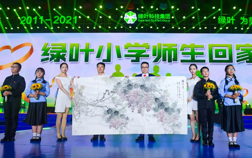 滨海县委教育工委书记、教育局党委书记、教育局体育局局长周青登台,代表滨海县教育系统17万师生,向绿叶多年来坚持捐资助学的爱心善举表示感谢,向绿叶科技集团10周年庆典表示祝贺。现场,周青书记与孩子们共同向徐建成董事长赠送了一幅凝聚祝福、寓意美好的画卷,徐建成董事长感动接过,并共同合影记录下了这珍贵的一刻。