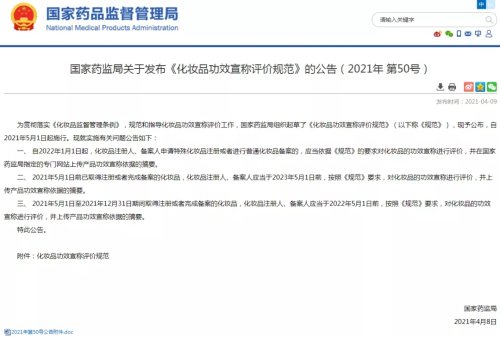 为贯彻落实《化妆品监督管理条例》,规范和指导化妆品功效宣称评价工作,国家药监局组织起草了《化妆品功效宣称评价规范》,自2021年5月1日起施行。