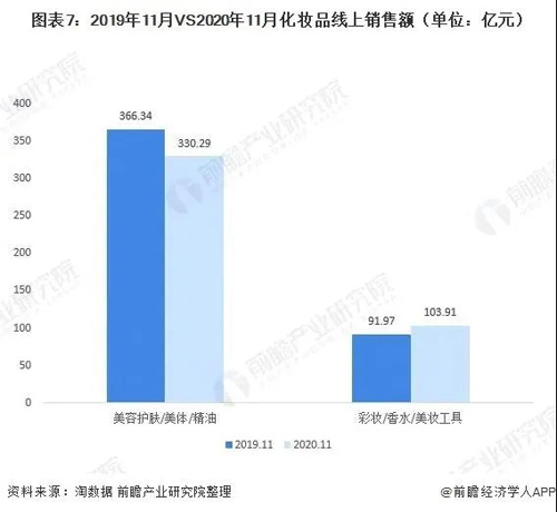 疫情影响下,我国化妆品线上销售规模进一步增长。化妆品在双十一等活动的刺激下,线上销售额屡创新高。根据淘数据粗略统计,2020年双十一期间(11月1日至11月11日,化妆品行业合计成交额为458.31亿元,超过2019年整个11月的成交额434.20亿元,其中,美容护肤/美体/精油销售额占大类,达330多亿元。