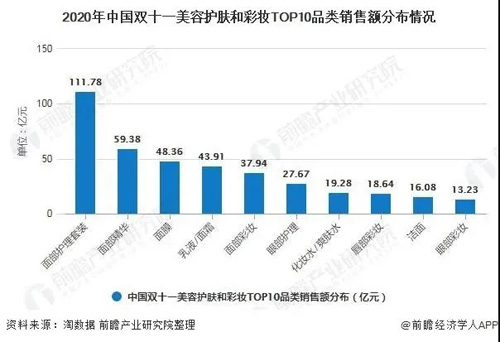 分产品看线上销售渠道化妆品销售情况,2020年双十一美容护肤彩妆销售TOP10品类中,面部护理套装销售额排名第一,达111.78亿元,其次为面部精华,达59.38亿元,前四位均为美容护肤品,彩妆产品排名较后。一方面与我国护肤品市场规模远高于彩妆产品市场规模有关,一方面相较于护肤产品,彩妆产品对于线下体验的程度与要求相对较高。