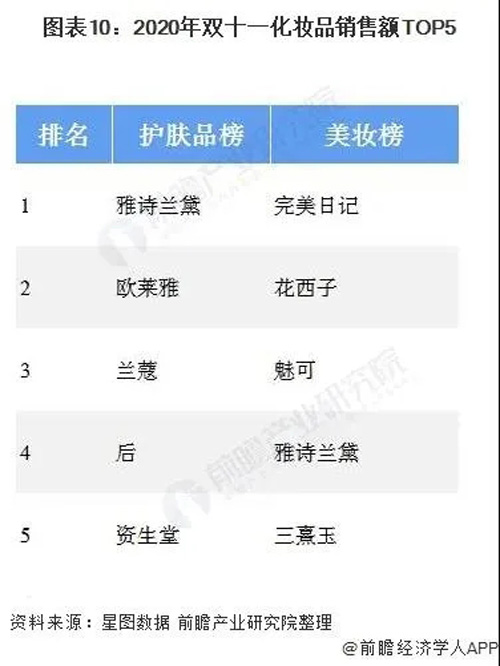 2020年,直播、短视频等营销模式仍在风口,双十一直播引导成交量创造新高,而化妆品作为直播销售模式下的重要品类,充分享受直播流量红利。完美日记、花西子等分别位于2020年双十一化妆品销售额第一和第二位。
