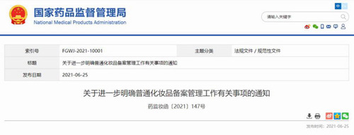 6月25日,国家药监局网站发布《关于进一步明确普通化妆品备案管理工作有关事项的通知》。