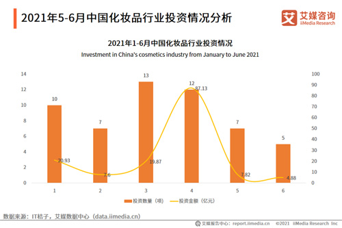 数据显示,2021年1-6月,中国化妆品行业发生投资事件月均9项,平均单笔投资额约2.745亿元。2021年4月化妆品行业的投资数量和投资金额达到高峰之后,二者在5月与6月均有一定幅度的回落,在监管措施的逐步出台完善,对化妆品行业的投资热度稍有降低。