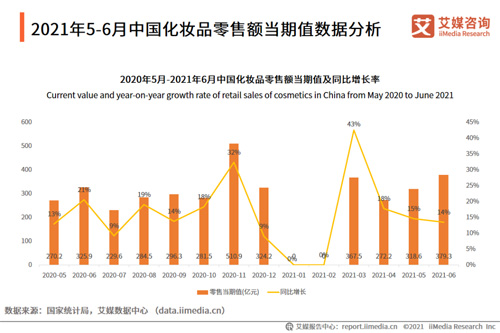 根据国家统计局数据显示,2021年1-2月的化妆品零售额的累计值为558.2亿元,5-6月两个月的化妆品零售额的总和为697.9亿元,可以看出各大电商平台的进一步竞争,也同时作用于化妆品本身的发展。618购物节的影响使得六月份化妆品零售额379.3亿元,为2021年上半年最高,相比于去年同期,5月份同比增长14.6%,6月份同比增长13.5%,回归到一个相对正常的稳定增长水平上。