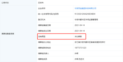 据企查查显示,宁波百益基因科技有限公司注册于2020年9月23日,注册资金100万元,法定代表人为许辉,同时也是该公司大股东及实际控制人,持股比例为100%。此外,企查查显示,该公司目前显示为“注销备案”,注销原因是决议解散。在今年4月14日,该公司发布公告称公司决议解散,拟向宁波市鄞州区市场监督管理局申请注销登记,请债权人自公告之日起45日内向清算组申报债权。