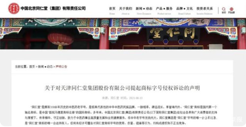 ▲8月13日,北京同仁堂发出声明,正式对天津同仁堂提起商标字号侵权诉讼。而此时正值天津同仁堂二度冲刺IPO的关键时期。北京同仁堂官方网站截图