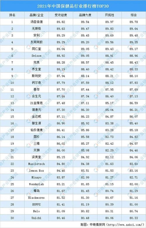 近日,互联网周刊发布2021保健品行业排行,汤臣倍健、无限极、安利、东阿阿胶、同仁堂、Swisse、完美、养生堂、斯利安、钙尔奇进入榜单前十。