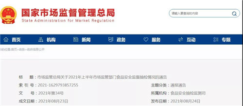 8月24日,市场监管总局通报了2021年上半年市场监管部门食品安全监督抽检情况。