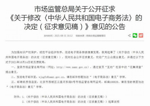 市场监管总局表示,为加强知识产权保护,规范平台经济秩序,促进电子商务持续健康发展,拟对《中华人民共和国电子商务法》第四十三条、第八十四条作出修改: