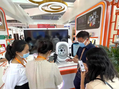 上午八九点钟,展会刚刚开始,现场已经聚集起不少的观众,各路媒体也开始了直播和采访。中国北京同仁堂展区的人气格外高涨。新增加的一项非遗技艺展示内容——手工泛丸传统制作技艺成为现场的一个焦点。这是一项传统的中药制药技术,能体现中医一人一方、辨证论治的精髓。工作了40多年,致力于小丸制剂工艺改进和传承的同仁堂股份一级大工匠田新民师傅现场献艺。只见他一手执竹匾,一手用竹刷往匾里掸水,然后经过推、拉、揉、闯、摔等多种手法的操作,一会儿工夫匾内的药粉就滚成了一颗颗均匀浑圆的小药丸。精湛的技艺吸引着路过的观众们驻足观看,看到精彩处纷纷举起手机拍摄,边拍边赞叹:“这可得手上有功夫啊!”现场一台连着显示器的检测设备也“吸粉”无数,前面排起了长长的“候诊”队伍。这是“同仁堂国际互联网医院中医智慧屏”,可以通过终端扫描采集人的面部、舌面信息,根据中医理论进行数据分析,最终给出检测结果和养生建议。