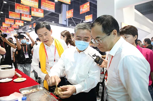 随后,领导嘉宾们还参观了康美药业展厅,查看了康美药业展出的康美三七粉、小包装中药饮片、康美鲜人参、康美菊皇茶、康美西洋参等特色主打产品。马建中充分肯定了康美药业中药饮片的质量,对于康美药业智慧药房模式特别是在新冠疫情期间发挥的作用予以高度认可。