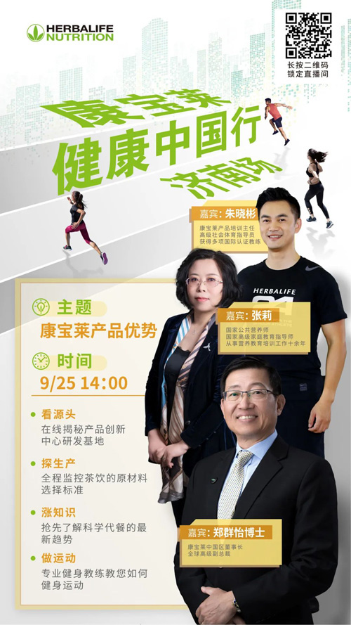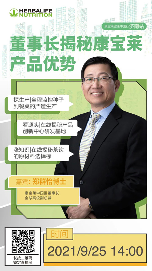 在市场竞争激烈的当下,优质的产品与优质的品质始终是市场不变的追求,而充分解析康宝莱品牌的战略核心你会发现“坚持品质、专注创新”一直是康宝莱产品发展的关键。9月24、25日, 郑群怡博士将在潍坊站、济南站活动现场,带你从康宝莱的生产源头、创新研发、原材料选择三点入手,为你揭秘康宝莱推行的“从种子到餐桌”战略布局。聚焦康宝莱产品的严谨生产,并带你深入康宝莱产品创新中心研发基地,在线揭秘产品的原材料选择标准,见证康宝莱产品的魅力。
