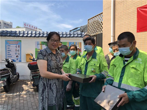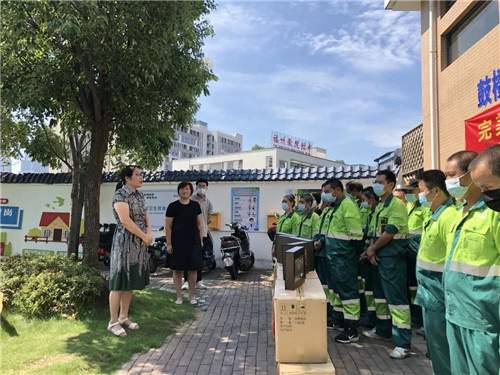 鼓楼区总工会温主席代表总工会感谢完美公司一直以来对基层劳动者的关怀,企业坚持公益道路,用爱温暖人心。在严峻的疫情防控之下,叮嘱环卫工人们在保障城市卫生干净整洁的同时,要做好自我防护,保障身体健康。